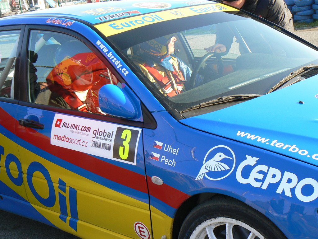 Následuje vřelé přivítání, dostáváme pásky pro vstup a dle Vaškových instrukcí míříme ke karavanu EuroOil. Tady nám Ášín předává nějaké poukázky, o kterých zatím netušíme, k čemu budou sloužit. Ještě nám upřesní, že s těmito máme být v 10:00 hod. u modrých pneumatik na závodišti a že si nás tam Petr usadí. „Aha, budeme asi někde na tribuně“, pomyslím si, už se tím nějak nezabývám a nasávám plnými doušky nádhernou rally atmosféru. Zdravíme se s široce se usmívajícím Péťou Uhlem a koukáme po stánku s kávou. Hledáme Vaška Pecha sen., ale Petr nám sdělil, že ten dorazí později. Kupujeme kávu a 09:50 hod. vyrážíme na smluvené místo. Před námi se již na místo dostavila i hrstka ostatních vyvolených, kteří v ruce třímají stejnou poukázku jako my. To mě ujistí, že jsme tady správně. Je 10:00 hod. a na místo přicházejí nejlepší mechanici na světě, tedy Ášínovci. O malý moment za nimi přiráží ke břehu své nádherné Evo Václav. První z fanoušků před námi s již zmiňovanou poukázkou dostává od Petra kuklu, sundává si bundu a směřuje k Ášínovu myšákovi. V těchto chvílích by se ve mně krve nedořezal a já pomalu začínám zjišťovat, k čemu ona poukázka slouží. „Já pojedu s Vaškem v ostrém Evu, přímo na trati v Sosnové???“, nemůžu se vzpamatovat z právě prodělaného šoku. Po zhruba dalších deseti minutách se mi o této skutečnosti podaří přesvědčit i bráchu,i když si myslím, že stejně jako já tomu nevěří doteď. Nevím, jak si mám s touto novou informací poradit a proto volám ihned přítele na telefonu. „Martinko, já asi pojedu s Vaškem v jeho autě po závodní dráze“, blekotám své ženě do mobilu. „Fakt? A těšíš se?“, ptá se mě. „No, teď se spíš bojím, když vidím jak Ášín vodí smykem myš po dráze“, odpovídám. Mám smíšené pocity. Nad strachem ale vítězí hrozná touha se s Václavem svézt v tak úžasném autě, to byl přece vždycky můj sen. Donekonečna se uklidňuju tím, že řidič, jež mne poveze, je nejlepší na světě a strach pomalu mizí. Nicméně kolena se mi třást nepřestali. Jsem na řadě, sundávám si bundu a mikinu, nasazuji kuklu a Péťa Uhel mi nasazuje přilbu ve válečných barvách EuroOilu. Tak ohromná čest a pokora, kterou jsem po celou dobu cítil, se nedá ani popsat. Soukám se do sedačky, Petr mi zapíná a utahuje pásy, přičemž sleduje moji nezdravě bledou barvu.